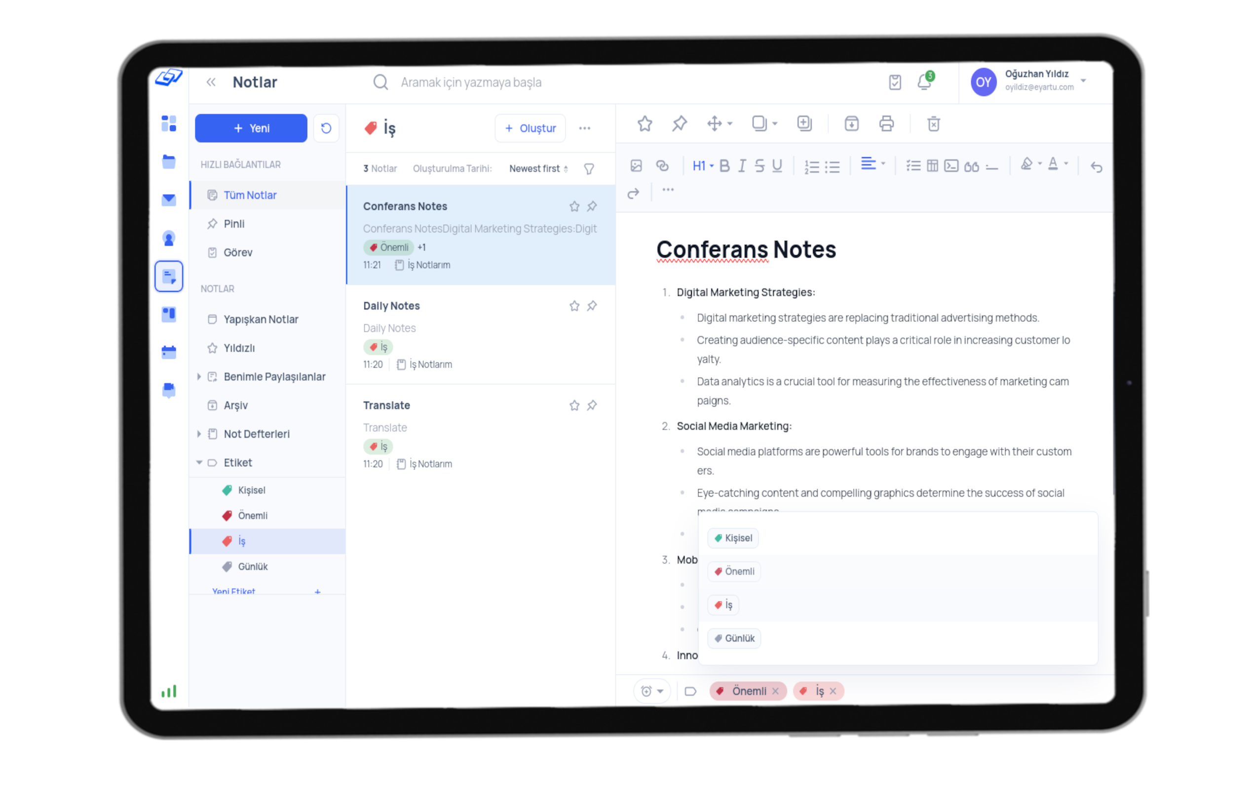 En önemli fikirleriniz ve bilgilerinizin tamamını depolayacağınız kişisel bir alan oluşturun. Notlarını etiketleyerek belirli bir düzen oluştur.