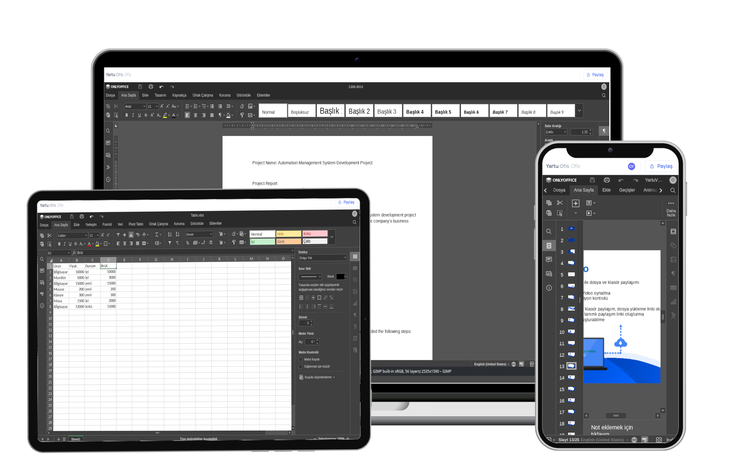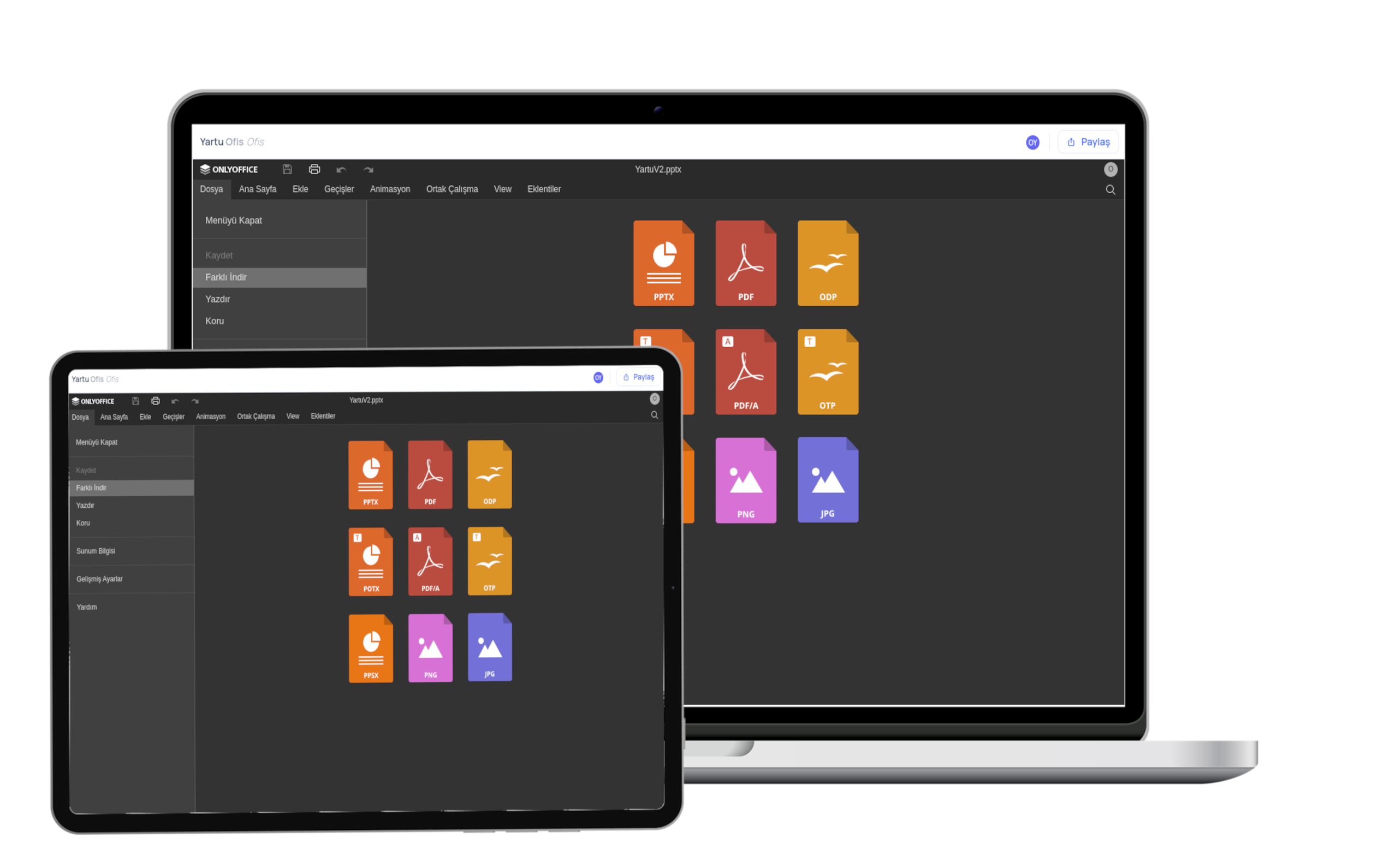Yartu Ofis; Microsoft Office ve açık döküman biçimindeki tüm ofis dosya tipleri ile çalışabilir ve bu dosyaları birbirlerine çevirebilir.